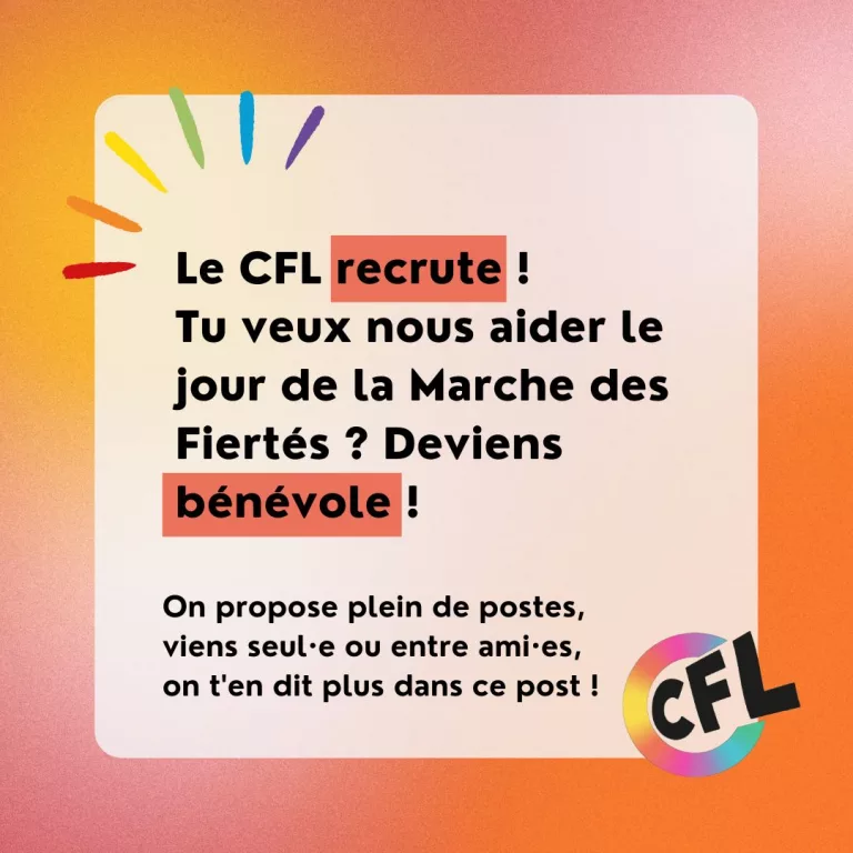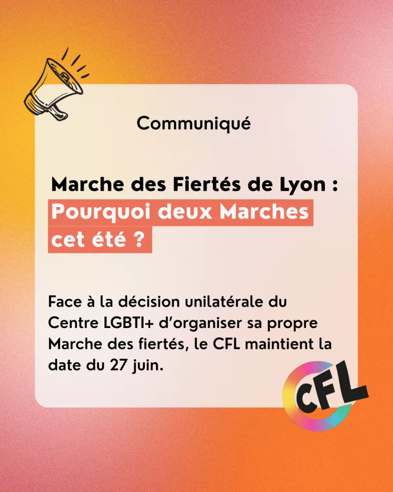 Vous êtes sur le site du Collectif Fiertés en Lutte (CFL pour les gens qui en ont marre de le répéter). L’association organise la Marche des Fiertés de Lyon depuis novembre 2019. L’objectif est de proposer une Marche inclusive et revendicative pour nos communautés !