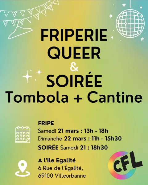 Friperie Queer – 21 & 22 Mars 2026 Le weekend du 21 et 22 mars prochain, le CFL à le plaisir de vous inviter à sa friperie queer de 2026 ! En bonus cette année, Charlie Gris, bénévole CFL depuis plus d’un an, vous attends sur son atelier retouches et personnalisation couture durant les horaires d’ouverture de la friperie. Au programme sur place : petites réparations, ajustements, personnalisation… et possibilité de confier vos trouvailles à Charlie si vous souhaitez un travail plus spécifique ou plus long ! 😊 Tous les prix sont libres et tous les bénéfices serviront à financer l’organisation de la Quinzaine et de la Marche des Fiertés 2026. Informations pratiques Friperie Queer 2026 Quand ? · Samedi 21 mars de 13h à 18h · Dimanche 22 mars de 11h à 15h30 Une soirée tombola est également organisée le samedi dès 18h30. Où ? Île Egalité : 6 Rue de l’Égalité, 69100 Villeurbanne Venez nombreux.ses !